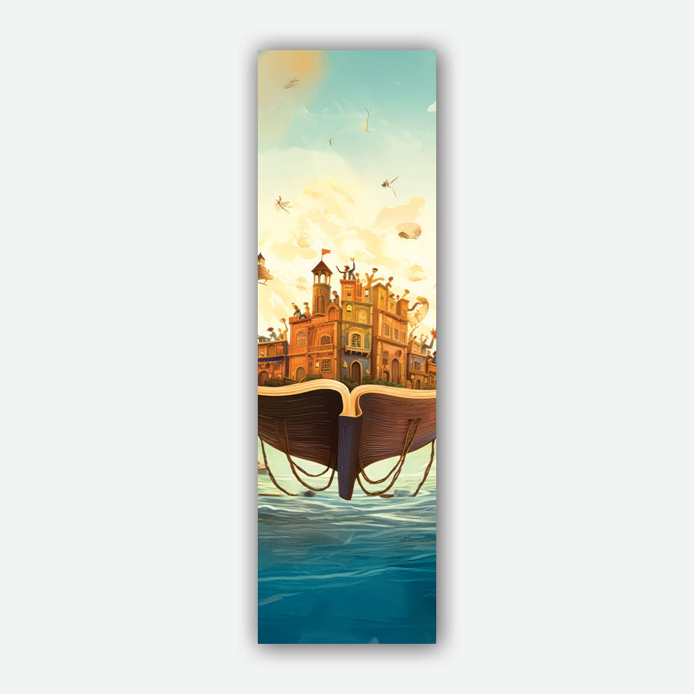 Embark on a magical journey with this imaginative bookmark, featuring a whimsical ship crafted from books, soaring through the skies. Perfect for dreamers and adventurers, it invites you to explore uncharted stories and navigate the seas of imagination with every page you turn.